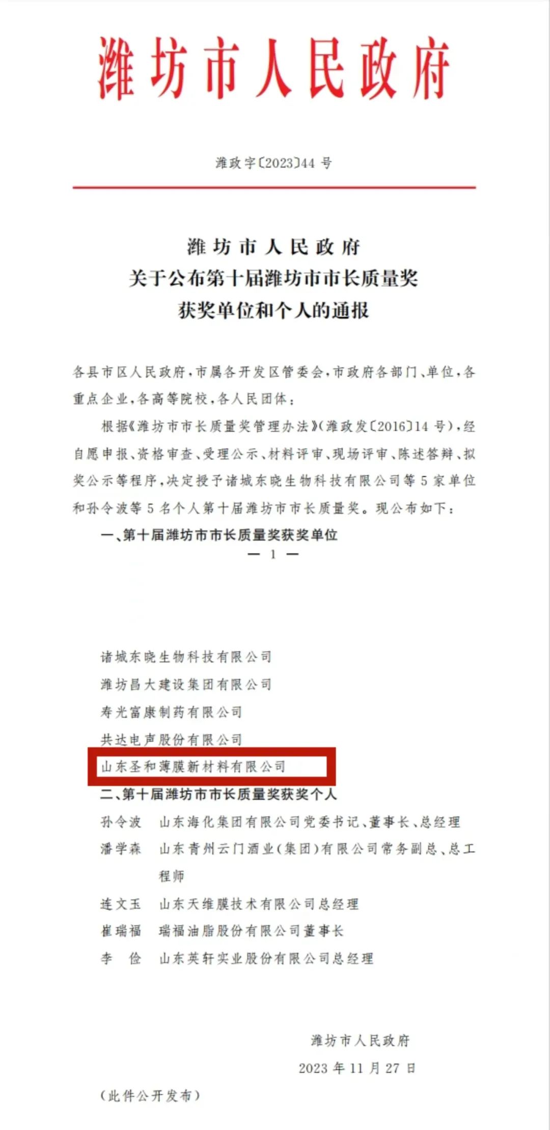 近日,2023年第十屆濰坊市市長質(zhì)量獎獲獎名單揭曉,山東圣和薄膜新材料有限公司等5家企業(yè)和個人榜上有名。